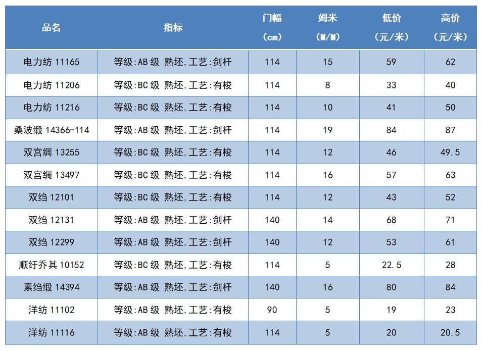 本周綢緞指數(shù)協(xié)作單位成交價(jià)格區(qū)間