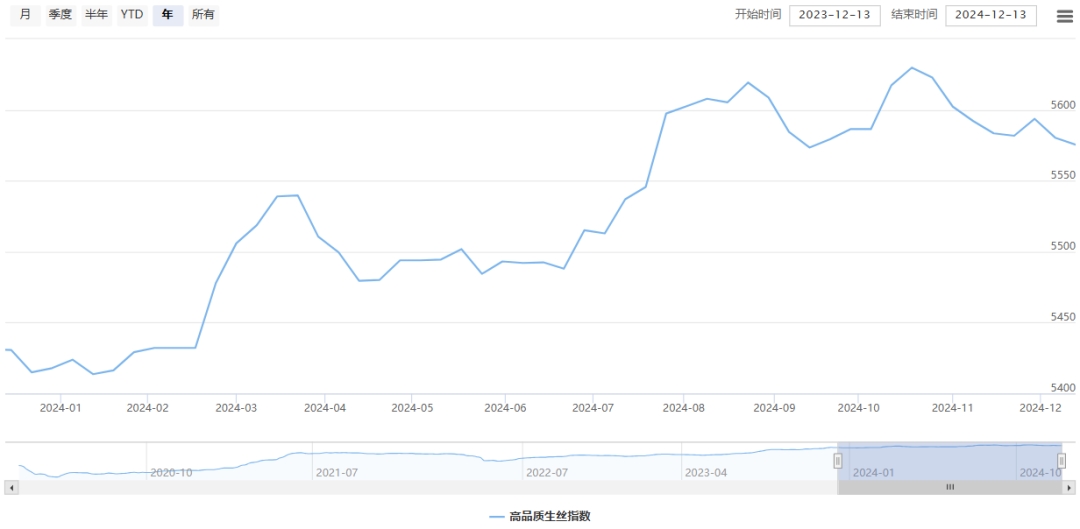 高品質(zhì)生絲指數(shù)上,協(xié)作單位所報(bào)成交筆數(shù)環(huán)比上周繼續(xù)下降,價(jià)格指數(shù)環(huán)比上周略下跌。