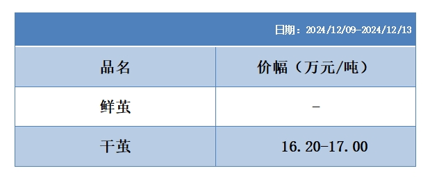 鮮繭指數(shù)上,全國(guó)范圍內(nèi),進(jìn)入12月中旬,只有海南的極少數(shù)地方最后一批鮮繭逐步上市。所以本周指數(shù)上,按照非鮮繭上市時(shí)間段的程序來(lái)倒推鮮繭價(jià)格,基于協(xié)作單位所報(bào)的蠶繭庫(kù)存數(shù)據(jù)的鮮繭價(jià)格指數(shù)環(huán)比上周上漲較多,顯示目前蠶繭庫(kù)存與生絲售價(jià)的繭絲倒掛情況較為明顯(針對(duì)農(nóng)戶繭絲)。