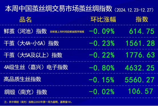 2024 年步入尾聲,本周作為本年度最后一個(gè)完整交易周,繭、絲、綢價(jià)格指數(shù)均呈現(xiàn)出環(huán)比上周的小幅下滑態(tài)勢,市場成交氛圍一般。盡管如此,歲末之際,部分企業(yè)受價(jià)格優(yōu)惠的吸引以及資金狀況的支撐,仍在持續(xù)推進(jìn)年前備貨工作,為新一年的生產(chǎn)經(jīng)營做準(zhǔn)備,市場在平淡中也蘊(yùn)含著一絲節(jié)前的忙碌與期待。