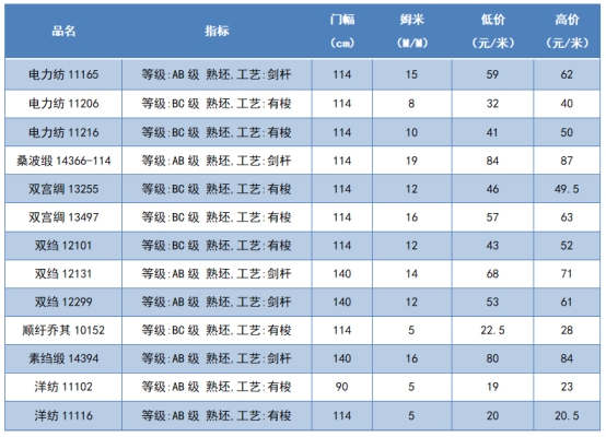 本周綢緞指數(shù)協(xié)作單位成交價(jià)格區(qū)間