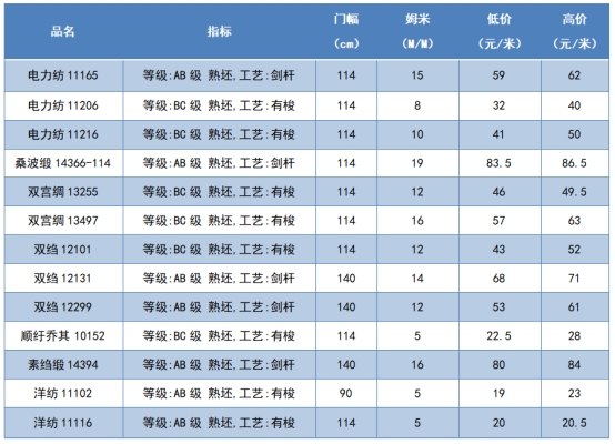 本周綢緞指數(shù)協(xié)作單位成交價(jià)格區(qū)間