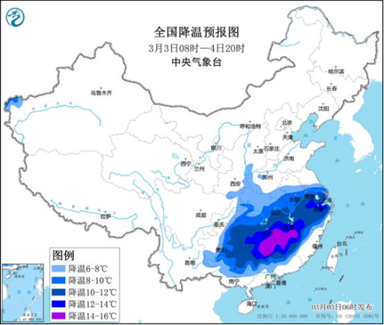 今天(3月3日),我國(guó)中東部大范圍雨雪持續(xù),部分地區(qū)有大到暴雪,明后天,我國(guó)降水總體有所減弱,但降水范圍仍然較大,需注意防范雨雪天氣對(duì)交通出行等方面的不利影響。在寒潮和降水影響下,今天江南等地將現(xiàn)“跨季式”降溫,多地氣溫降幅可達(dá)20℃左右,體感由初夏回到冬天,公眾請(qǐng)注意添衣保暖。