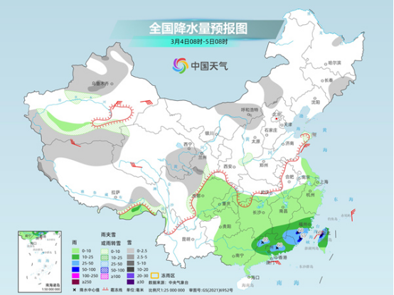 具體來看,中央氣象臺預計,今天,新疆北疆和南疆盆地、西藏北部和東南部、內(nèi)蒙古中西部、西北地區(qū)東南部、川西高原北部、吉林東部、山東半島等地的部分地區(qū)有小雪或雨夾雪,局地有中雪。江南東部和南部、華南北部、臺灣島等地的部分地區(qū)有中到大雨,其中,福建東南部、廣東東南部等地局地有暴雨。