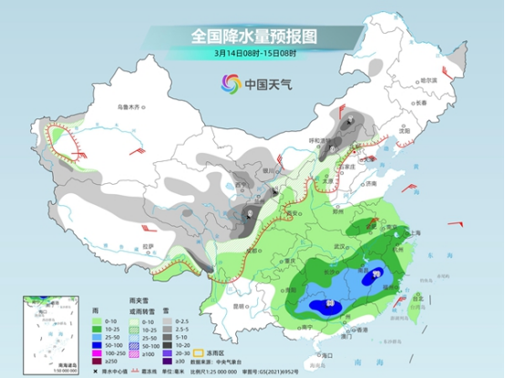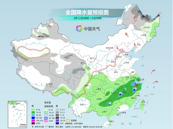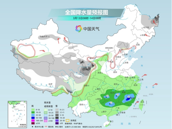 今起至周末,南方將有大范圍降雨天氣,江南、華南部分地區(qū)雨勢較強,或現(xiàn)暴雨,上述地區(qū)局地伴有短時強降水、雷暴大風等強對流天氣。此外,今天黑龍江、內(nèi)蒙古東部多地仍有降雪,需警惕積雪和道路結(jié)冰對交通的不利影響。