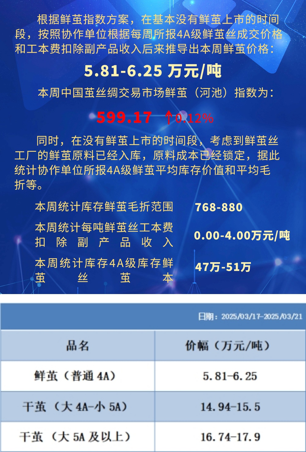 根據(jù)本周蠶繭報(bào)價(jià)按照指數(shù)方案形成的基準(zhǔn)品價(jià)格區(qū)間
