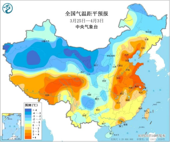 未來10天,華北東部、東北地區(qū)南部、黃淮、江淮、江漢、江南北部及青藏高原等地平均氣溫較常年同期偏高1~4℃;全國其余大部地區(qū)平均氣溫基本接近常年。
