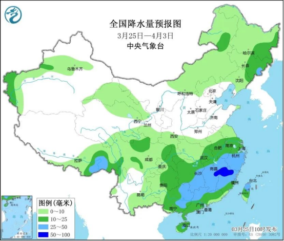 預(yù)計未來10天(3月25日至4月3日),江淮、江南、華南以及貴州東部、重慶、西藏東南部等地有10~30毫米,其中江西東部、福建北部等地的部分地區(qū)有40~60毫米。與常年同期相比,全國大部地區(qū)降水量偏少。