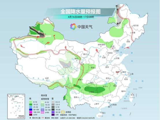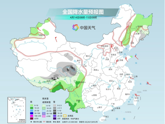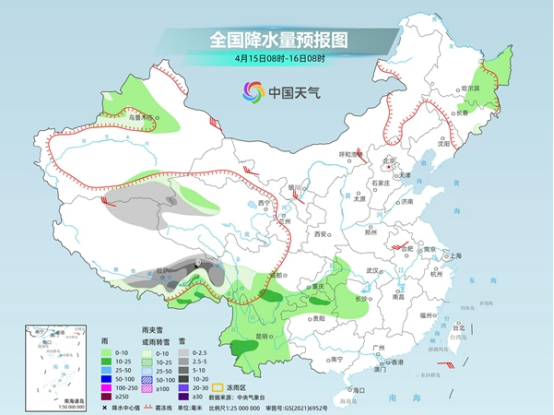 后天,內(nèi)蒙古東北部、黑龍江西北部、新疆沿天山地區(qū)和伊犁河谷、西藏東部和南部、青海北部和南部、川西高原北部等地部分地區(qū)有小到中雪或雨夾雪,其中,內(nèi)蒙古東北部部分地區(qū)有大雪。新疆北部、內(nèi)蒙古中東部、西藏東部、西北地區(qū)東南部、江南西部、西南地區(qū)中部等地部分地區(qū)有小到中雨。