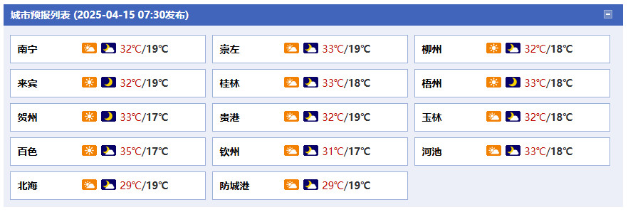 南寧市:今天白天到晚上,多云間晴,偏南風1~2級,最高氣溫32℃,最低氣溫19℃。