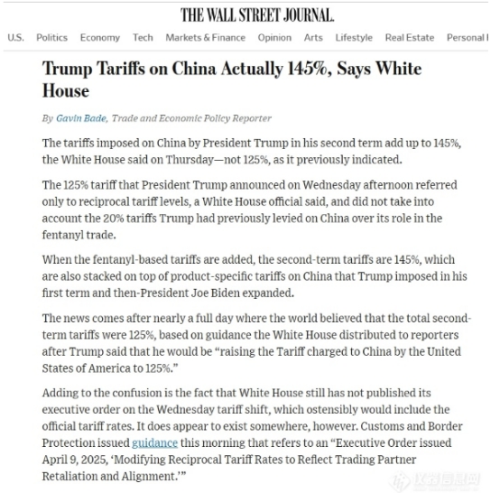 美西時間4月10日,據(jù)《華爾街日報》報道,白宮周四表示,特朗普總統(tǒng)第二任期內(nèi)對中國征收的關(guān)稅總額為 145%,而不是之前所說的 125%。