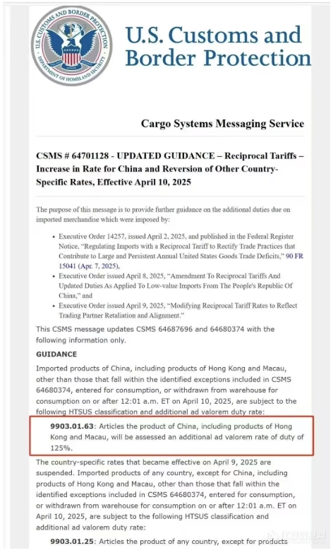 2025年4月10日 截止至4月10日,特朗普宣布對中國征收的關(guān)稅提高到125%。根據(jù)CSMS文件顯示,美國針對我國上調(diào)的是“對等關(guān)稅”,從84%上調(diào)至125%,疊加4月前加征的20%關(guān)稅,中國商品累計關(guān)稅將達145%。