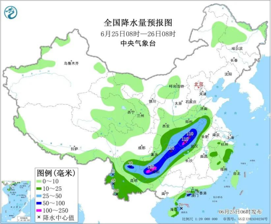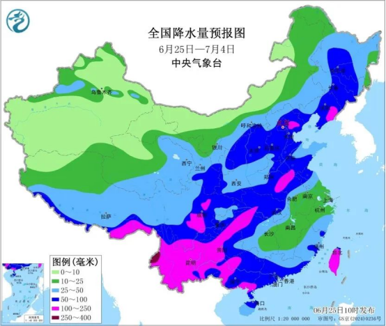 未來10天(6月25日至7月4日),主要降雨區(qū)位于黃淮、江漢、江南西北部、華南、西南地區(qū)及西藏東部等地,累計降水量有50~110毫米;上述大部地區(qū)累計降水量較常年同期偏多2~7成,局地偏多1倍左右。