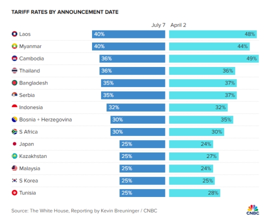 昨日,特朗普普表示將從8月1日起分別對來自日本、韓國等14個國家的進(jìn)口產(chǎn)品征收25%至40%不等的關(guān)稅。
