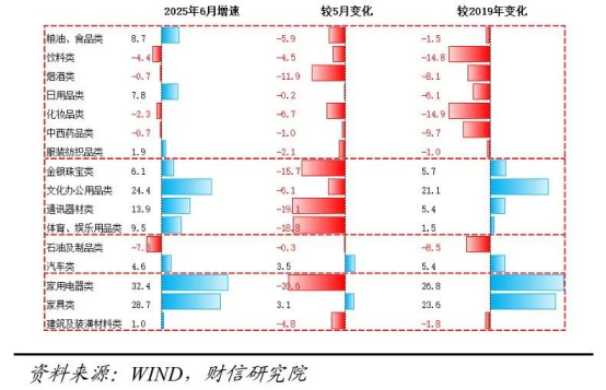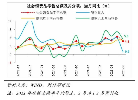 上半年社會(huì)消費(fèi)品零售總額同比增長5.0%,較去年全年提高1.5個(gè)百分點(diǎn),總體保持較好恢復(fù)態(tài)勢(shì)。但6月當(dāng)月社零同比增長4.8%,在去年基數(shù)大幅走低的基礎(chǔ)上(2024年6月社零增速較上月回落1.7個(gè)百分點(diǎn)至2.0%),仍較上月回落1.6個(gè)百分點(diǎn);環(huán)比增長-0.16%,創(chuàng)歷史同期最差表現(xiàn),消費(fèi)邊際放緩較多。