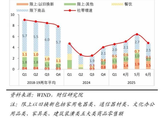 往后看,預(yù)計(jì)下半年社零增速或繼續(xù)放緩。一是受高基數(shù)和乘數(shù)效用邊際趨弱的拖累,下半年以舊換新政策的拉動(dòng)作用大概率減弱。二是隨著內(nèi)外需放緩壓力加大,居民就業(yè)或明顯承壓,“就業(yè)-收入-消費(fèi)”循環(huán)待暢通,將制約消費(fèi)能力改善空間。