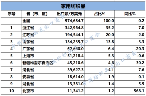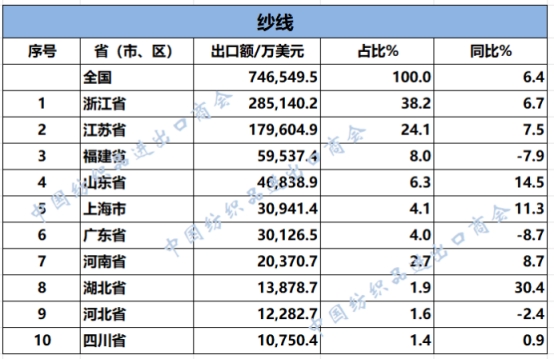 2025年1-6月紡織服裝類重點(diǎn)商品出口前十名的省(市、區(qū))