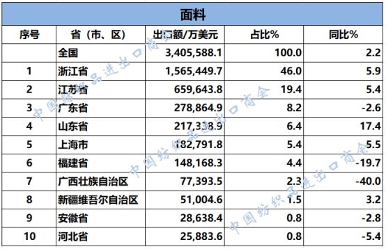 2025年1-6月,我國紡織服裝累計(jì)出口1439.97億美元,同比增長0.8%。浙江省、江蘇省、廣東省、山東省、福建省分別列全國紡織服裝出口省市前五位,合計(jì)比重超七成。