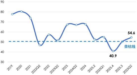 2025年上半年,世界經(jīng)濟(jì)復(fù)蘇乏力,單邊主義、保護(hù)主義加劇,多邊主義、自由貿(mào)易受到嚴(yán)峻挑戰(zhàn);國(guó)內(nèi)經(jīng)濟(jì)運(yùn)行總體平穩(wěn)、穩(wěn)中向好,在復(fù)雜多變的國(guó)內(nèi)外環(huán)境中展現(xiàn)了強(qiáng)大的韌性和活力。我國(guó)產(chǎn)業(yè)用紡織品行業(yè)克服了國(guó)內(nèi)外多重不利因素影響,保持了穩(wěn)中有進(jìn)的態(tài)勢(shì)。根據(jù)協(xié)會(huì)調(diào)研,2025年上半年我國(guó)產(chǎn)業(yè)用紡織品行業(yè)的景氣指數(shù)為54.6,處于微景氣區(qū)間(圖1)。