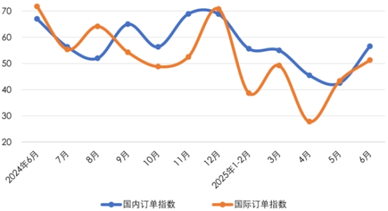 圖2 2024年6月-2025年6月產(chǎn)業(yè)用紡織品行業(yè)國(guó)內(nèi)外市場(chǎng)需求情況