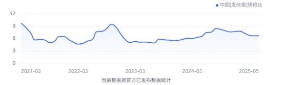 豬肉價(jià)格走勢(shì)進(jìn)一步反映市場(chǎng)需求疲軟與通縮壓力。近期豬價(jià)持續(xù)下滑,部分地區(qū)已跌入6元區(qū)。豬糧比呈現(xiàn)波動(dòng)下降趨勢(shì),從2024年8月的8.44降至2025年5月的6.69。據(jù)發(fā)改委監(jiān)測(cè),近日全國(guó)平均豬糧比價(jià)跌至6∶1以下。