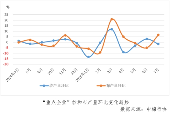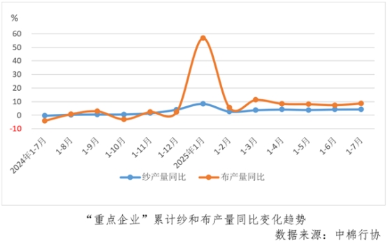1-7份,“重點(diǎn)企業(yè)”紗產(chǎn)量同比增長(zhǎng)4.2%,較1-6月份擴(kuò)大0.1個(gè)百分點(diǎn),布產(chǎn)量同比增長(zhǎng)8.7%,較1-6月份擴(kuò)大1.3個(gè)百分點(diǎn)。7份紗產(chǎn)量環(huán)比下降1.7%,較6月份由增轉(zhuǎn)降,布產(chǎn)量環(huán)比增長(zhǎng)6.6%,較6月份由降轉(zhuǎn)增。