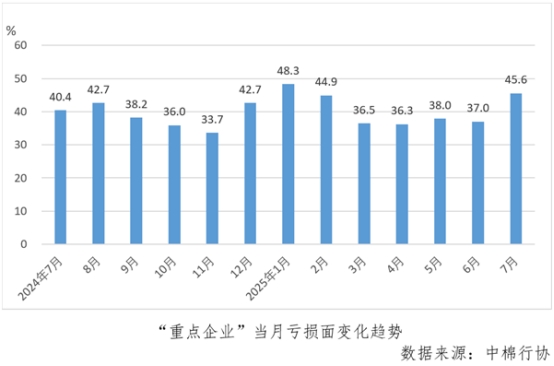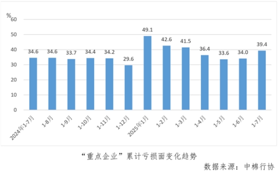 1-7月份,“重點(diǎn)企業(yè)”累計(jì)虧損面為39.4%,較1-6月份擴(kuò)大5.4個(gè)百分點(diǎn)。7月份當(dāng)月虧損面為45.6%,較6月擴(kuò)大8.5個(gè)百分點(diǎn),僅低于本年度1月份。