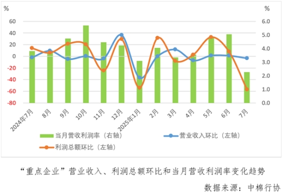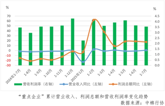 據(jù)中國(guó)棉紡織行業(yè)協(xié)會(huì)跟蹤的重點(diǎn)企業(yè)(以下簡(jiǎn)稱“重點(diǎn)企業(yè)”)數(shù)據(jù), 1-7月份,“重點(diǎn)企業(yè)”營(yíng)業(yè)收入同比增長(zhǎng)0.8%,較1-6月份由降轉(zhuǎn)增,利潤(rùn)總額同比增長(zhǎng)17.3%,較1-6月份下降1.3個(gè)百分點(diǎn),營(yíng)收利潤(rùn)率為3.5%,較1-6月份下降0.1個(gè)百分點(diǎn),年內(nèi)僅高于1月份。