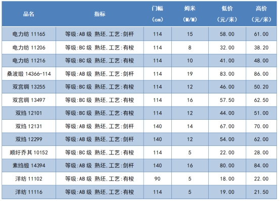 本周綢緞指數(shù)協(xié)作單位成交價格區(qū)間