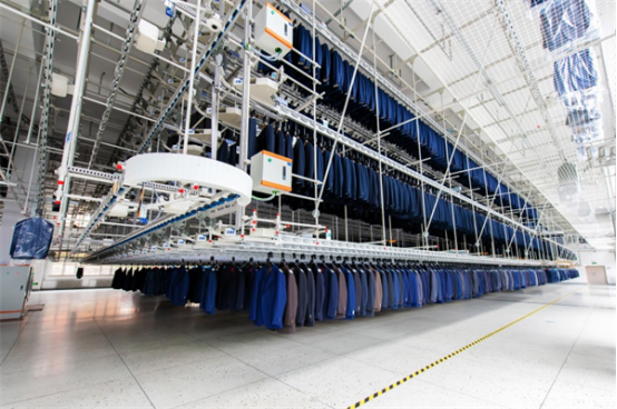 在改造過(guò)程中,大楊集團(tuán)圍繞定制生產(chǎn)全流程突破關(guān)鍵技術(shù):自主研發(fā)的 “智能懸掛式高速分揀與存儲(chǔ)系統(tǒng)” 獲中國(guó)服裝行業(yè)科技進(jìn)步一等獎(jiǎng),采用雙軌設(shè)計(jì)、單件流水模式,智能裁剪生產(chǎn)線運(yùn)用國(guó)際先進(jìn)3D投影技術(shù),按CAD版型數(shù)據(jù)處理系統(tǒng)傳輸?shù)某叽?,?shí)現(xiàn) “一衣一款”精準(zhǔn)切割,相比傳統(tǒng)裁剪節(jié)省10%-30% 用料成本;智能倉(cāng)儲(chǔ)系統(tǒng)可存儲(chǔ)各類服裝4.9萬(wàn)件,入庫(kù)效率達(dá)1000件/小時(shí),分揀效率超1000套/小時(shí),通過(guò)分列式設(shè)計(jì)與算法優(yōu)化,實(shí)現(xiàn)多通道并行管理,滿足全球定制訂單“多客戶、多品類、嚴(yán)交期”的需求。