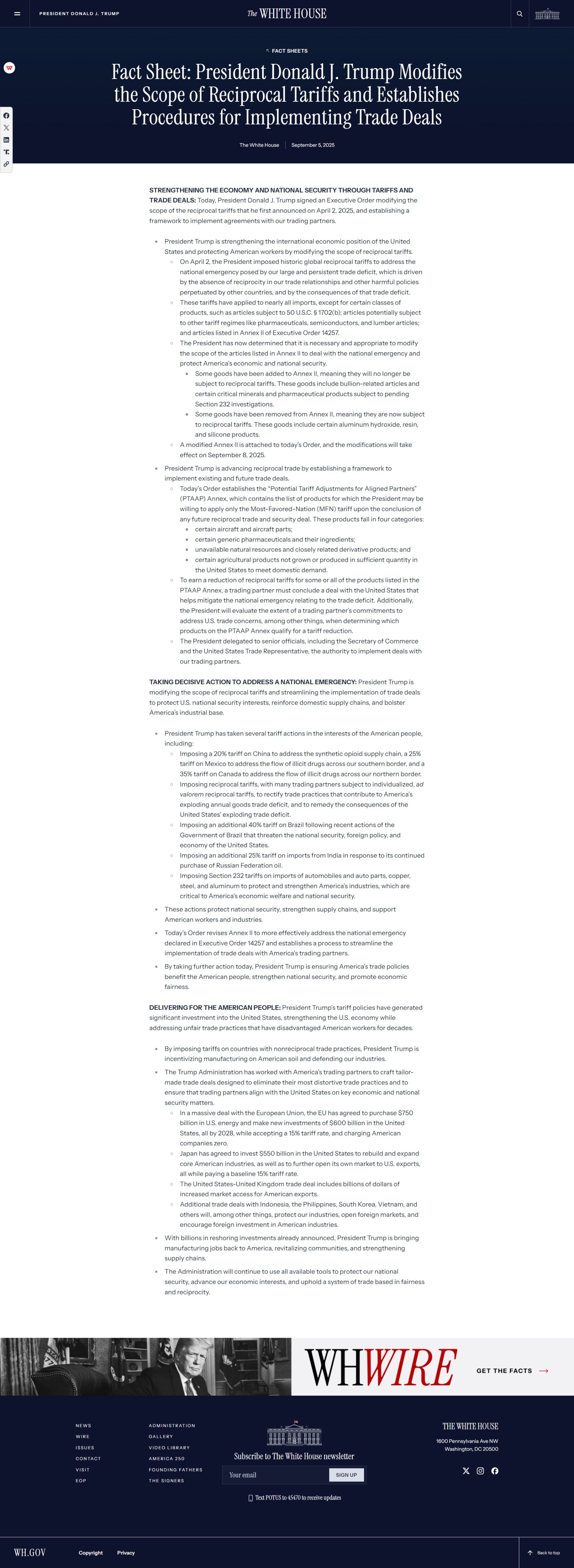 今日發(fā)布的命令修訂了附件二,以更有效地應(yīng)對第 14257 號行政命令中宣布的國家緊急狀態(tài),并建立流程以簡化與美國貿(mào)易伙伴的貿(mào)易協(xié)定落實(shí)工作。