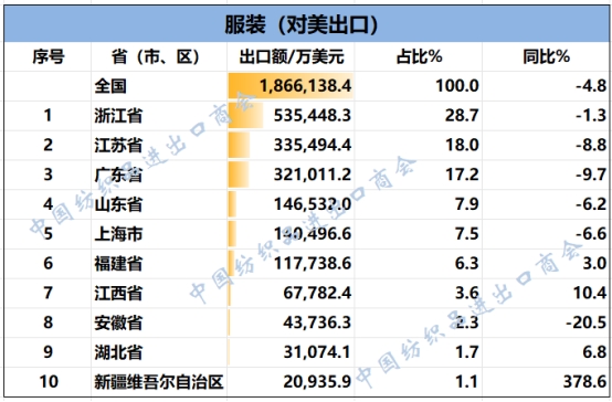 2025年1-7月,我國紡織服裝累計對美出口261.54億美元,同比下降5.9%。浙江省、江蘇省、廣東省、山東省、上海分別列全國紡織服裝對美出口省市前五位,合計比重超八成。