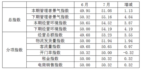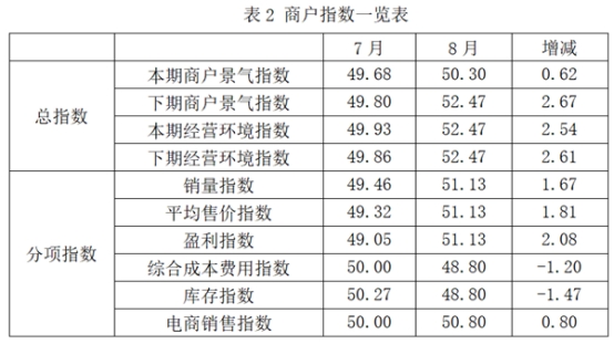 從商戶景氣指數來看,總指數中,8月商戶景氣指數為50.30,較上期上升0.62個百分點;經營環(huán)境指數為52.47,較上期上升2.54個百分點。