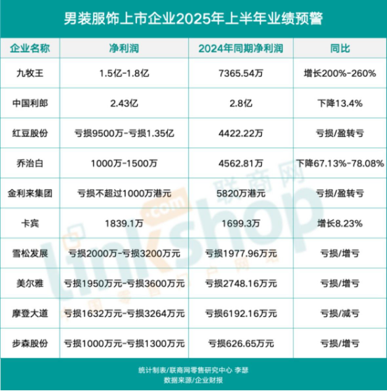 男裝方面來看,目前發(fā)布的10家企業(yè)中,有6家出現(xiàn)虧損。男裝版塊最賺錢的則是中國利郎,2025年上半年中國利郎凈利潤為2.43億元。此外,雪松發(fā)展、美爾雅、步森股份增虧,摩登大道減虧。