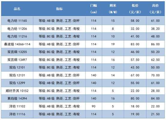 本周綢緞指數(shù)協(xié)作單位成交價格區(qū)間