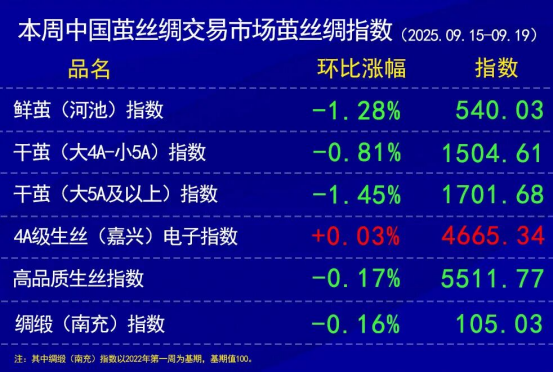 鮮繭指數(shù)上,本周的第二批廣西秋繭質量下降,凈度等偏差,跨省鮮繭收購價格有所下調,云南、安微、四川部分地區(qū)因質量原因價格和繭本也有所控制。本周鮮繭價格指數(shù)環(huán)比上周繼續(xù)有所下調。