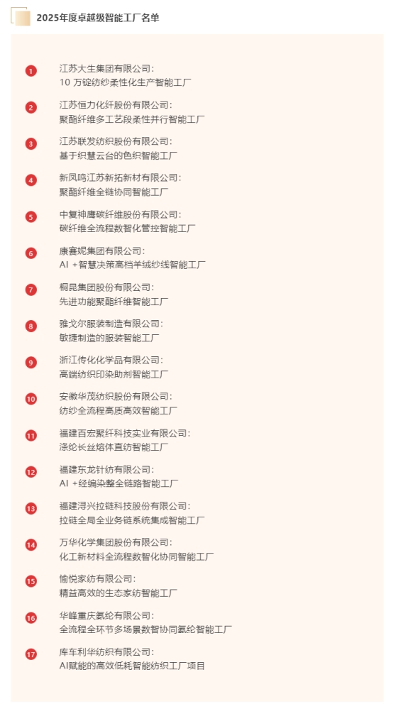 近日,工業(yè)和信息化部發(fā)布的2025年度卓越級(jí)智能工廠名單公示期已結(jié)束,共有274家入選,其中紡織服裝行業(yè)有17家企業(yè)憑借在智能化領(lǐng)域的卓越實(shí)踐脫穎而出。這一結(jié)果不僅彰顯了紡織行業(yè)在數(shù)字化轉(zhuǎn)型浪潮中的積極探索,也為行業(yè)未來發(fā)展樹立了新的標(biāo)桿。