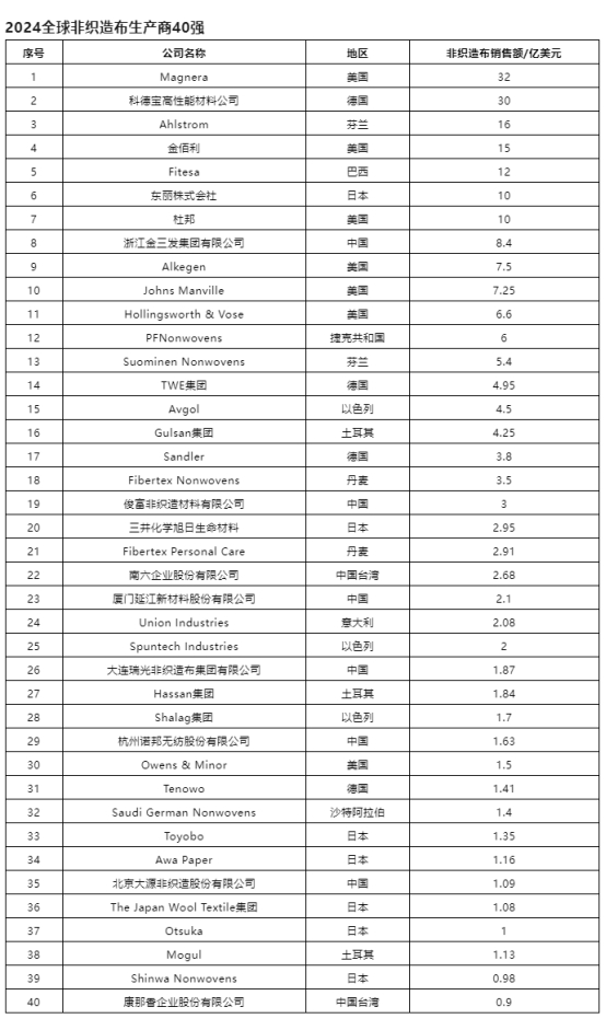 據(jù)了解,該榜單以2024年非織造布業(yè)務(wù)的銷售額為排名依據(jù)。盡管美國、日本、西歐等成熟市場仍是全球領(lǐng)先非織造布企業(yè)的重要聚集地,但新興市場企業(yè)的影響力正加速提升,成為推動行業(yè)格局演變的關(guān)鍵力量,其中,巴西、土耳其、中國、印度尼西亞等國家的企業(yè)表現(xiàn)尤為突出。