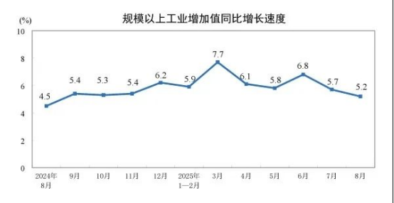 8月份,規(guī)模以上工業(yè)增加值同比實際增長5.2%(增加值增速均為扣除價格因素的實際增長率)。從環(huán)比看,8月份,規(guī)模以上工業(yè)增加值比上月增長0.37%。1—8月份,規(guī)模以上工業(yè)增加值同比增長6.2%。