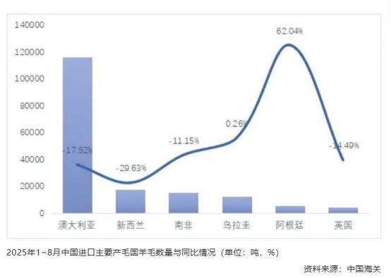 中國進(jìn)口羊毛數(shù)量仍處于持續(xù)回落區(qū)間。1-8月羊毛累計(jì)進(jìn)口20.4萬噸,同比下滑12.7%,其中含脂毛累計(jì)進(jìn)口17.2萬噸,同比下跌15.1%。從三個(gè)主要產(chǎn)毛國澳大利亞、新西蘭和南非進(jìn)口的羊毛數(shù)量同比跌幅也表明,國內(nèi)對(duì)羊毛原料需求的不足情況尚未結(jié)束。