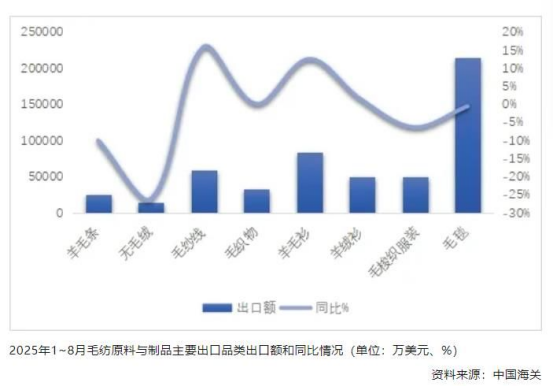 中國海關(guān)數(shù)據(jù)顯示,2025年1-8月,毛紡原料與制品進(jìn)出口總額104億美元(人民幣金額744億元),同比下跌2.9%。其中,毛紡原料與制品出口額80.1億美元(人民幣金額575億元),同比增長1.9%,進(jìn)口額23.5億美元(人民幣金額168億元),同比下跌16.3%。