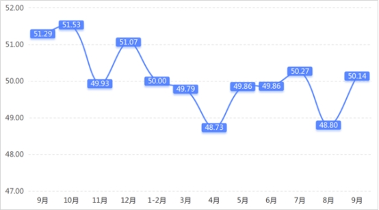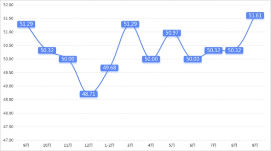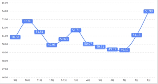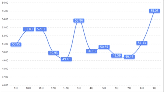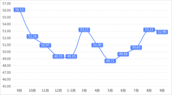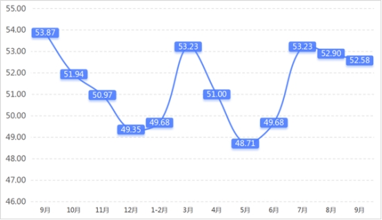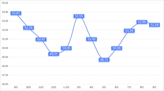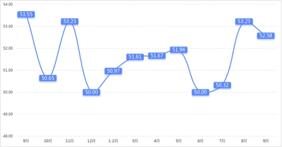 從管理者景氣指數(shù)來看,總指數(shù)中,9月管理者景氣指數(shù)為52.42,較上期上升0.16個百分點;經(jīng)營環(huán)境指數(shù)為54.84,較上期上升0.65個百分點。