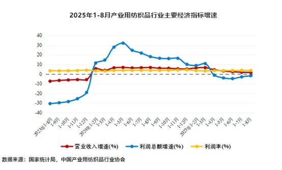 2025年1-8月,世界經(jīng)濟在地緣政治沖突加劇、關(guān)稅沖擊、產(chǎn)供鏈碎片化等多重挑戰(zhàn)中艱難前行,全球經(jīng)濟增長動能減弱;我國經(jīng)濟總體保持平穩(wěn)增長態(tài)勢,但增速呈現(xiàn)溫和放緩趨勢,工業(yè)生產(chǎn)保持較快增長、消費增速放緩、出口韌性較強但仍面臨挑戰(zhàn)。我國產(chǎn)業(yè)用紡織品行業(yè)運行整體平穩(wěn),工業(yè)增加值增速有所放緩。