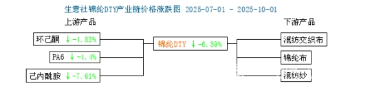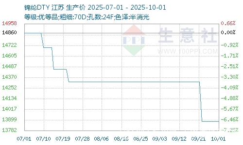 2025年第三季度,錦綸長絲市場缺乏利好,價格走勢整體向下。以錦綸DTY為例,截止9月30日,江蘇地區(qū)錦綸長絲DTY(優(yōu)等品;70D/24F)報價13880元/噸,較去年同期下跌4340元/噸,跌幅達(dá)23.82%。
