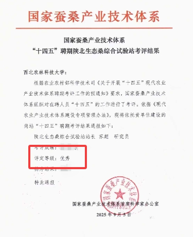 近日,國家蠶桑產(chǎn)業(yè)技術體系首席科學家辦公室通報“十四五”聘期考評結果,國家蠶桑產(chǎn)業(yè)技術體系陜北生態(tài)桑綜合試驗站榮獲綜合考評“優(yōu)秀”等次。這是繼“十三五”考評為優(yōu)秀后再次獲評優(yōu)秀。