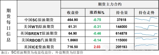 【1】WTI主力原油期貨收跌0.19美元,跌幅0.31%,報61.31美元/桶;布倫特主力原油期貨收跌0.3美元,跌幅0.46%,報64.9美元/桶;INE原油期貨收跌0.75%,報464.9元。