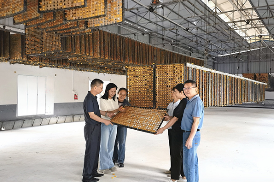 在柳城縣沖脈鎮(zhèn)春綠桑蠶專業(yè)合作社的標(biāo)準(zhǔn)化蠶房內(nèi),豐收景象惹人注目。金黃色蠶繭掛滿蠶蔟,色澤鮮亮奪目,宛如綴滿枝頭的“黃金果”?!肮鹦Q12號”是2022年通過省級審定的抗逆性天然黃繭新品種,黃繭率達(dá)到100%,其抗血液型膿病能力較傳統(tǒng)品種提升1000倍。服務(wù)組在合作社詳細(xì)了解該品種的飼養(yǎng)情況,實(shí)地開展高產(chǎn)、優(yōu)質(zhì)種養(yǎng)配套技術(shù)指導(dǎo)。