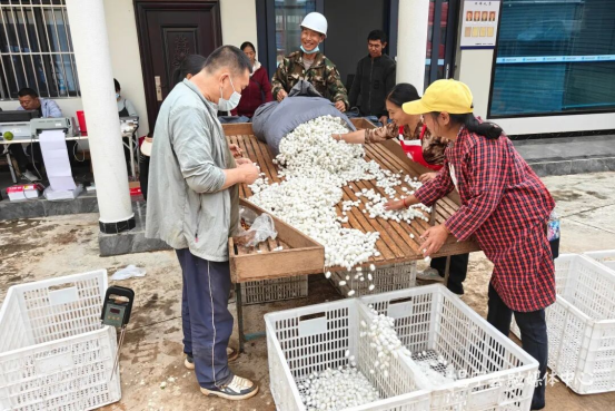 “今年你家的繭子個(gè)頭大、色澤亮,肯定能賣個(gè)好價(jià)錢?!薄澳慵业囊膊徊?,看著就扎實(shí)飽滿?!币淮笤?,蠶農(nóng)們便肩扛裝滿蠶繭的竹筐,有序排隊(duì)等候收購(gòu),相互交流著養(yǎng)蠶心得,不時(shí)傳來陣陣贊嘆。收購(gòu)現(xiàn)場(chǎng),工作人員熟練地進(jìn)行蠶繭品質(zhì)鑒定、等次劃分、抽樣檢測(cè)、過磅稱重、開單兌付等一系列操作,流水線式的作業(yè)高效有序,將一袋袋蠶繭轉(zhuǎn)化為蠶農(nóng)手中沉甸甸的收入,現(xiàn)場(chǎng)繁忙而喜慶。