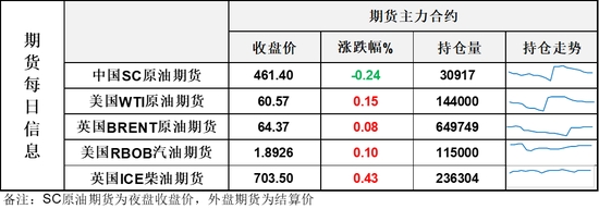 【1】WTI主力原油期貨收漲0.09美元,漲幅0.15%,報(bào)60.57美元/桶;布倫特主力原油期貨收漲0.05美元,漲幅0.08%,報(bào)64.37美元/桶;INE原油期貨收跌0.24%,報(bào)461.4元。