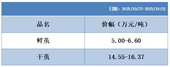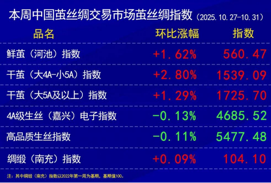 本周秋繭收購市場延續(xù)強勢。宜州等核心產(chǎn)區(qū)秋繭收購表現(xiàn)突出,收購均價從上周五的55元/公斤左右攀升至60 元/公斤左右。受廣西秋繭上市量偏少、質(zhì)量分化明顯影響,跨省收購積極性高漲,進而帶動省外鮮繭收購價格同步上行,本周鮮繭指數(shù)環(huán)比上漲 1.62%。